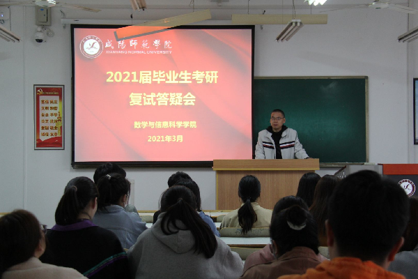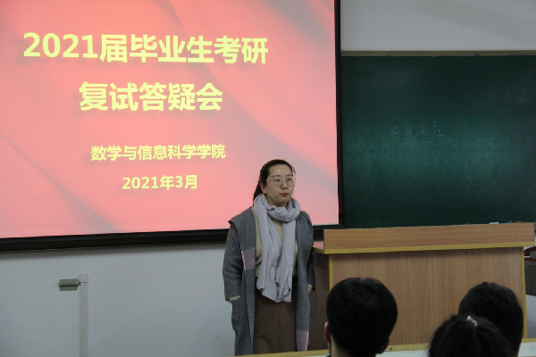 3月18日, 数学与信息科学学院召开2021届毕业生考研复试调剂答疑会。会议由毕业班辅导员朱墩子主持,应用数学系教师、考研上线同学参加了会议。