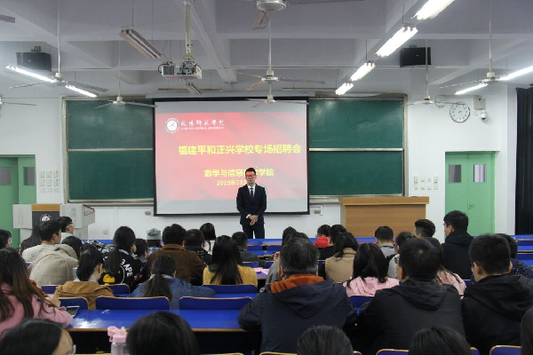 11月12日,数学与信息科学学院邀请福建平和正兴学校在2号楼410举办专场招聘会。数信学院及公司部分师范专业毕业生参加了招聘会。