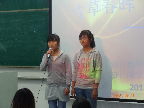 一首绵长悠远的亲情歌曲,一页华丽唯美的励志篇章。10月20日晚7:00,在2号楼310教室举行了由数学与信息科学学院团学联秘书部和女生部联合举办了“寸草春晖,笃实博学”诗歌朗诵大赛。出席本次比赛的有数信院团学联员工会副主席,各部部长,副部长,干事及各参赛选手和亲友团。