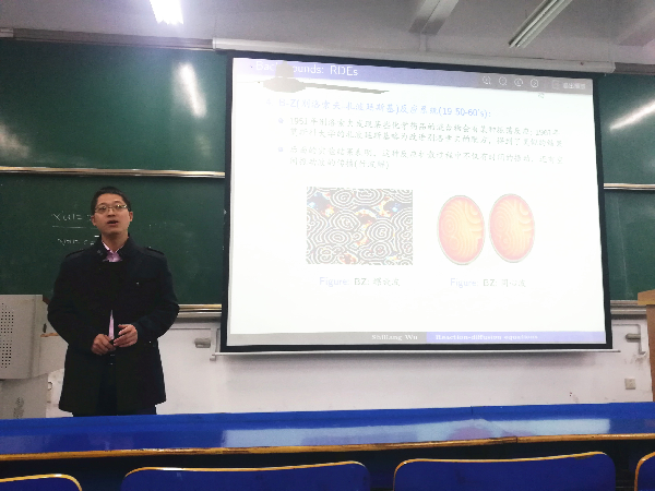 吴事良首先向大家详细地介绍了反应扩散方程的定义及其行波解的意义,并向大家强调了行波解是发展型方程的一类重要解及重要定理;接着,为大家讲解了一些经典反应扩散方程背后的故事、相关问题的基本概念、重要研究问题及解决问题的重要方法,并分析了当前国内外研究现状和研究进展;最后,吴教授展示了自己近期的研究成果,并对今后进一步的研究工作向大家做了介绍。