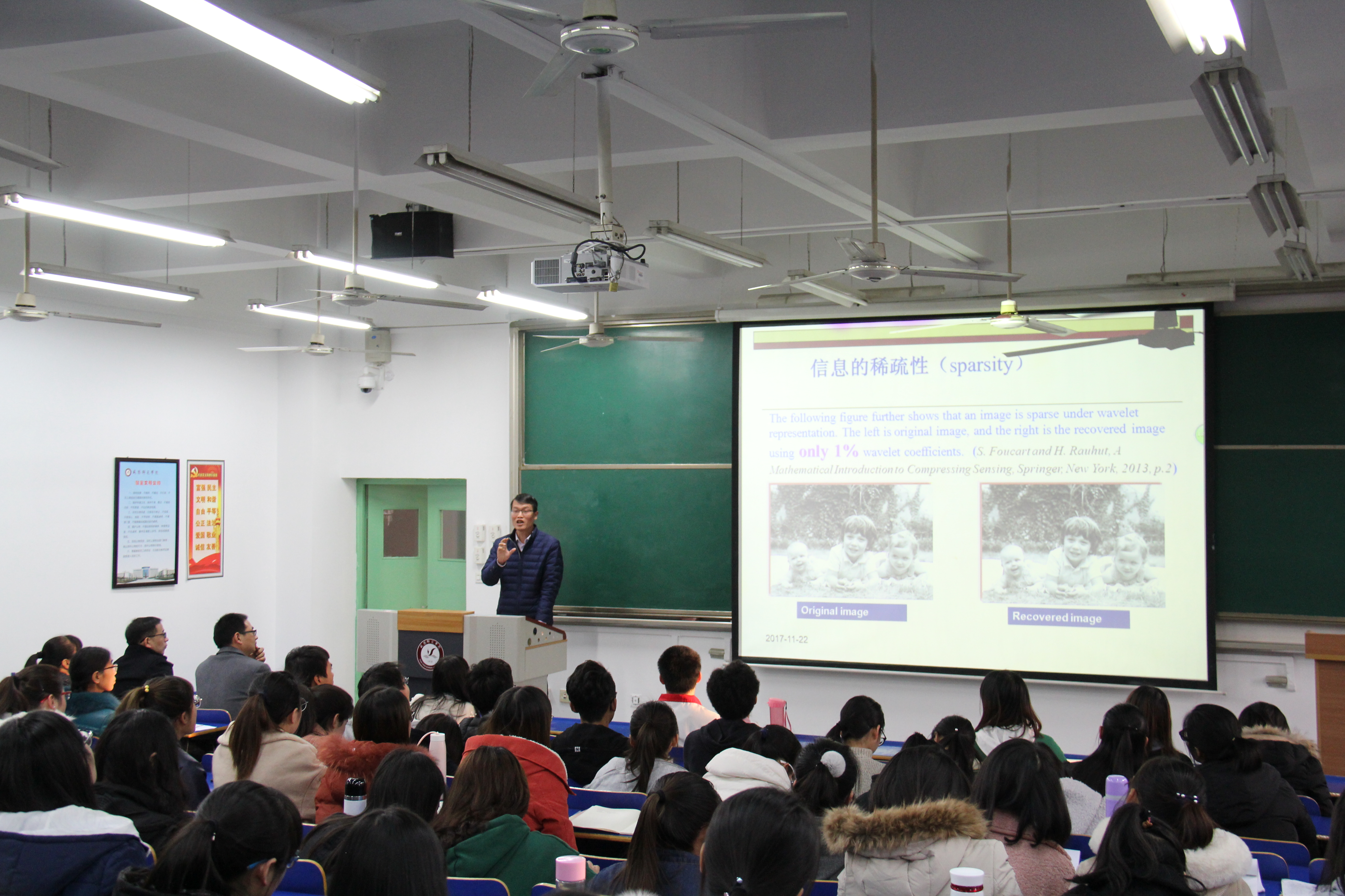 报告会上,李海洋教授结合自己的研究工作介绍了压缩感知的理论背景和相关前沿问题,并从稀疏字典设计、测量矩阵设计、重建算法设计等方面对压缩感知的基本理论和实现方法进行了系统阐述。李教授的报告,不仅让同学们了解了压缩感知理论的相关知识,也让大家体会到数学应用的广泛性,激发了员工深入学习的兴趣。