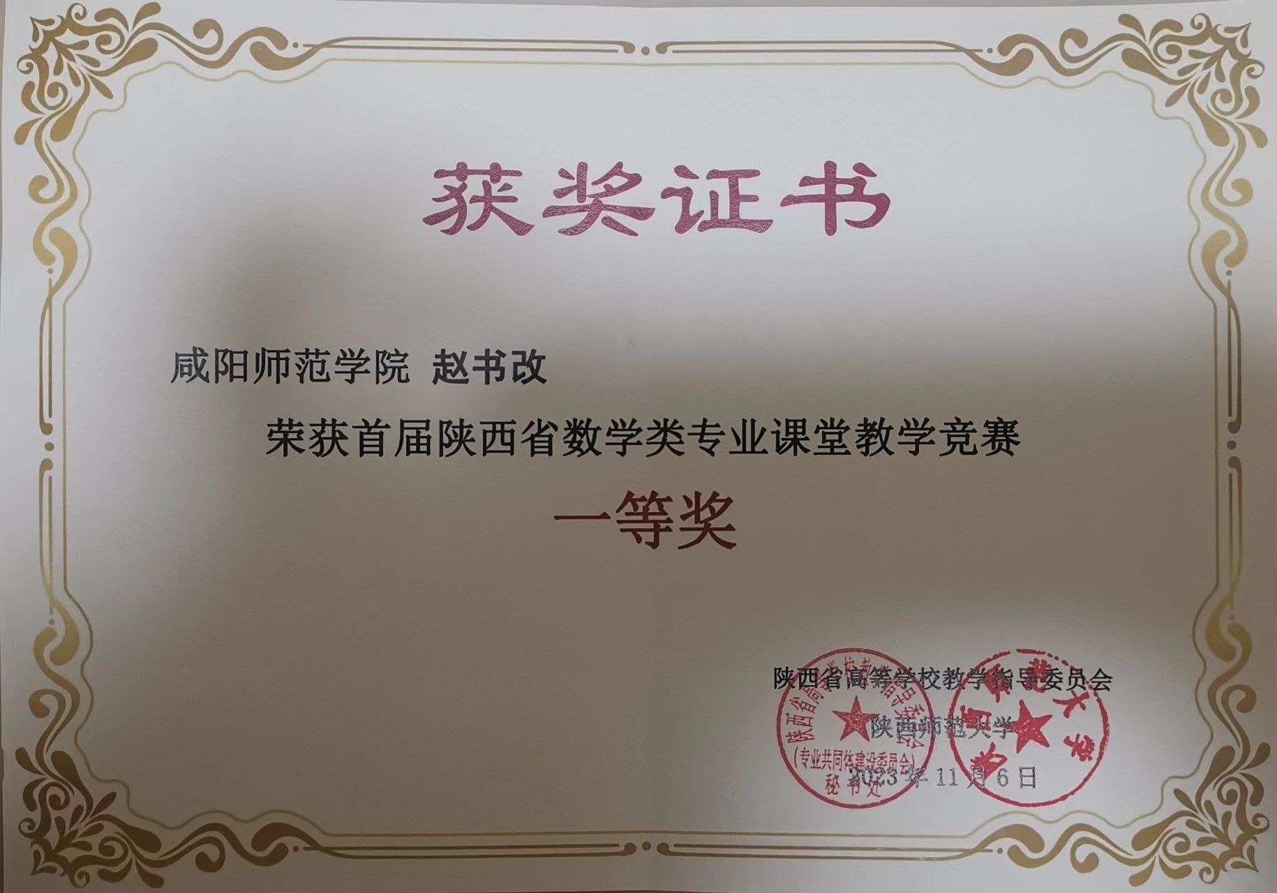 2023年11月17日-18日,第三届陕西省高等学校数学类专业建设研讨会暨首届陕西省高校数学类专业课堂教学竞赛颁奖仪式在西安电子科技大学举行。会议聚焦数学类专业建设、课程建设等议题,公司赵书改老师凭借扎实的知识功底、过硬的教学能力,荣获大赛一等奖!